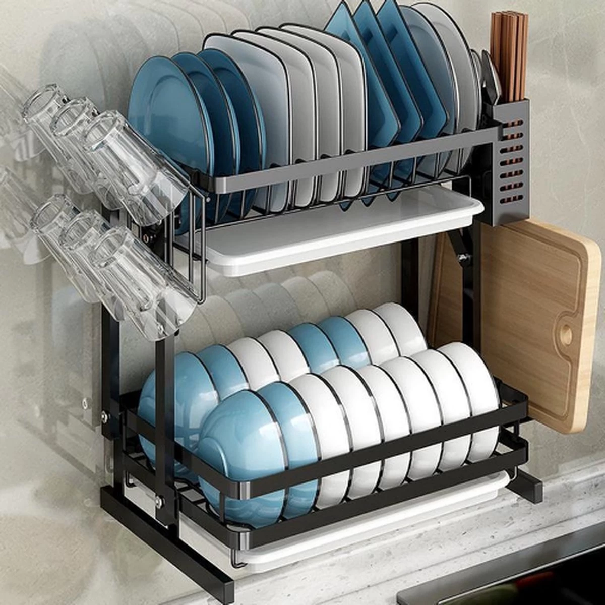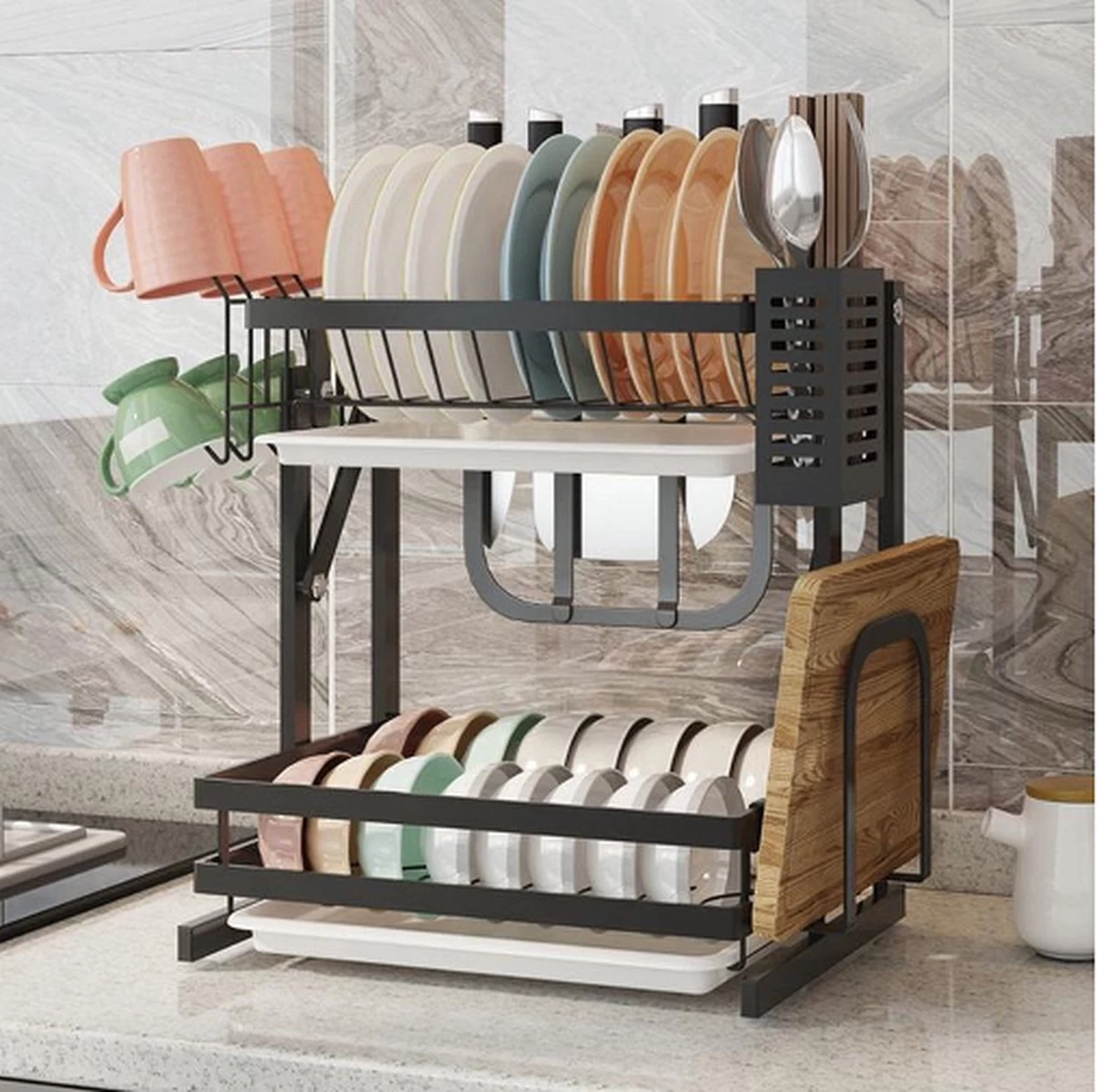 Doogo® Afdruiprek Met Lekbak 2 Laags – Inklapbaar – Muur Hangen Mogelijke – Afwasrek – Met 2 Lekbakken – Extra Accessories Voor Servies En Snijplanken – RVS
