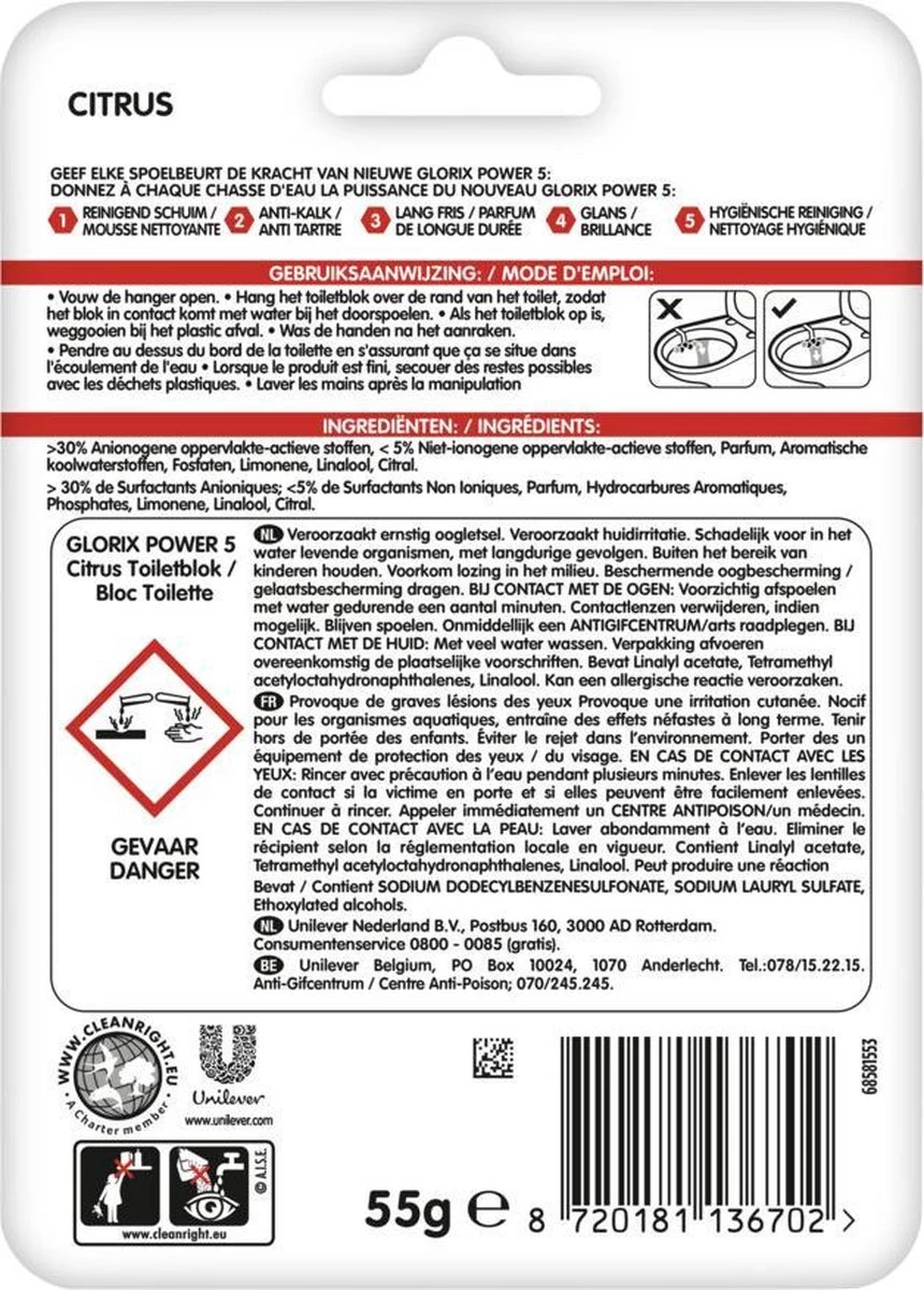Het Glorix Citrus WC blok geeft elke spoelbeurt de kracht van Glorix Power 5, tot wel 300 spoelbeurten lang. Het product heeft diverse voordelen! Het reinigend schuim met anti-kalk werking houdt je toilet lang fris en zorgt bovendien voor glans en een hygiënische reiniging. Zo geniet jij dagelijks van een schoon toilet. De hanger is bovendien 100% recyclebaar! Gebruiksaanwijzing: – Vouw de hanger open. – Hang het toiletblok over de rand van het toilet, zodat het blok in contact komt met water bij het doorspoelen. – Als het toiletblok op is, weggooien in de vuilnisbak. – Was de handen na het aanraken.