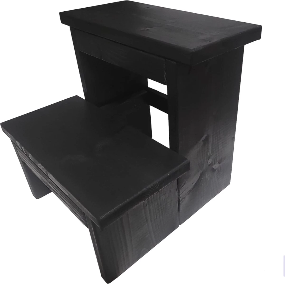 Dit keukentrapje is gemaakt van nieuw steigerhout. Alles wordt met handgemaakt. Je kan er gebruik van maken zoals een zitplaats voor spontane bezoeken, als opstapje om bij die hoge boekenplank te komen of als klein opbergmeubel in de woon- en slaapkamer. Deze houten kruk is behandeld met zwarte beits