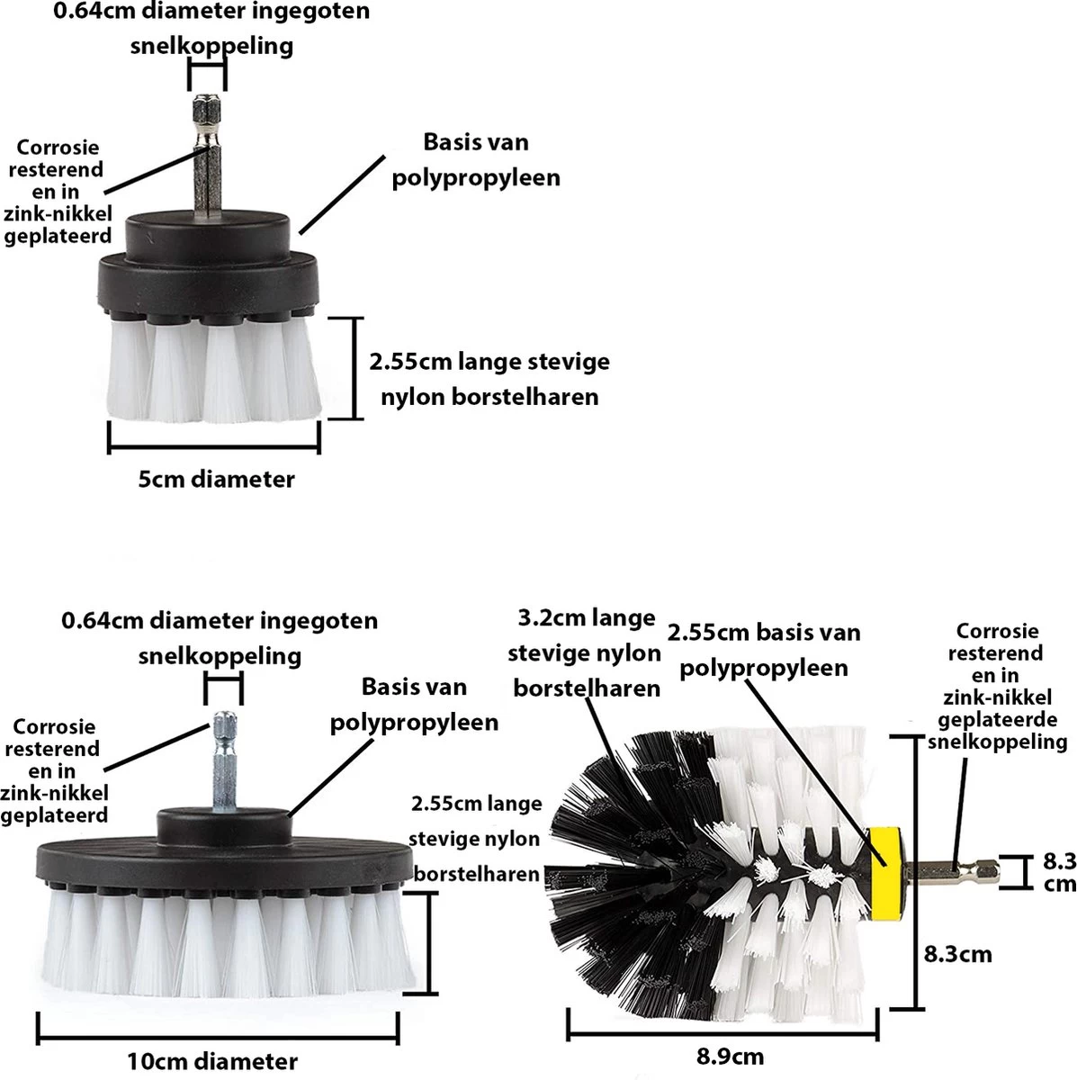 De witte zachte 3-delige borstelset voor boormachine kan in binnenhoeken en wielspaken reiken. Ook werken de borstels perfect op tapijten, vloermatten en deurpanelen.