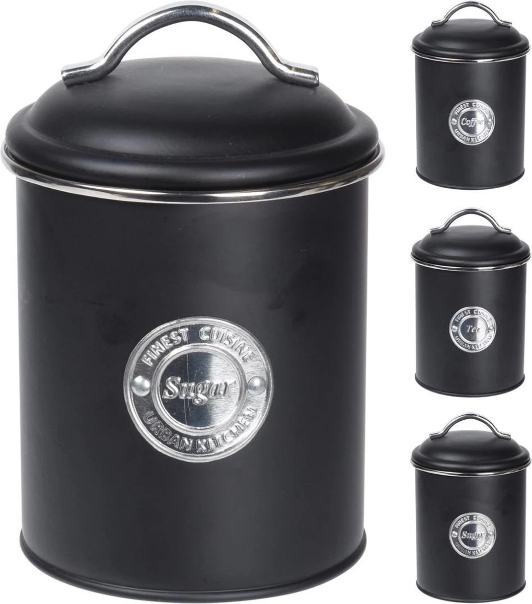 Bewaar je voorraad nu zichtbaar in stijl. Deze drie stoere retro voorraadpotten beschikken over zilveren labels met de teksten: coffee, tea en sugar. Super leuk om neer te zetten in een open keukenkastje of op een wandplank.