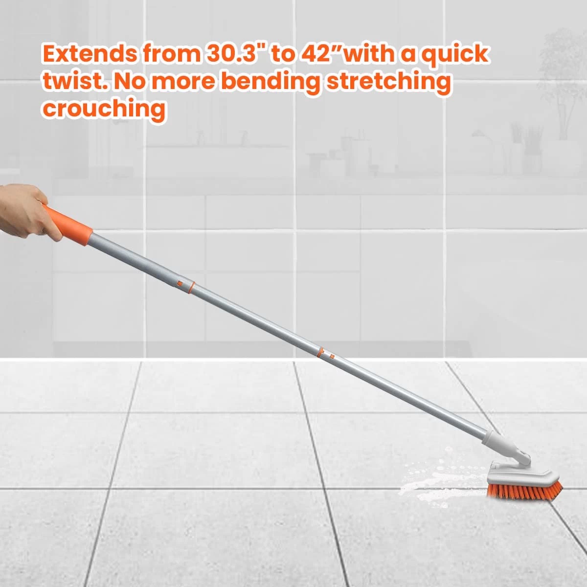 TELESCOPISCHE HANDGREEP EN TAILLE: Deze reinigingsborstel met telescopische handgreep schuift tijdens het draaien van 30″ tot 42″ uit, zodat u niet hoeft te knielen of te bukken om de badkamer schoon te maken.